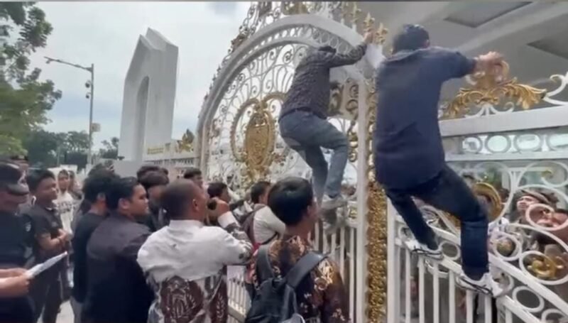 Dalam aksi ini, puluhan mahasiswa sempat membuka paksa pagar gerbang kantor Gubernur Sumut.