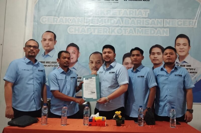 MEDAN, SUARASUMUTONLINE.ID – Ketua Umum Gerakan Pemuda Barisan Nasional (GPBN), Muhammad Daffasya Adnan Sinik menyerahkan mandat SK Pengurus Kota Medan, Sabtu (20/9).