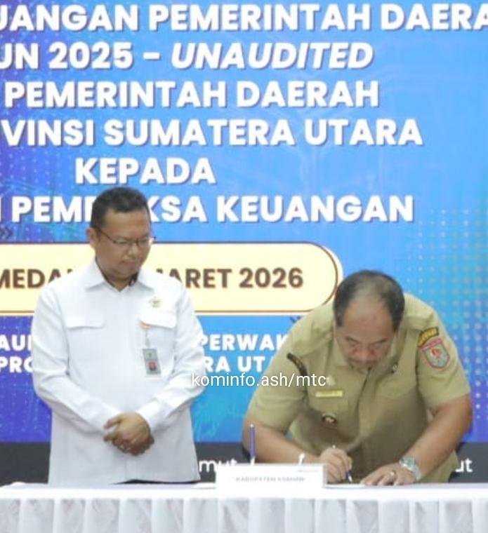 ASAHAN, SUARASUMUTONLINE.ID : Bupati Asahan menyerahkan LKPD tahun anggaran 2025 ke BPK RI perwakilan Sumatera Utara di auditorium BPK RI Sumatera Utara, Senin (30/3).