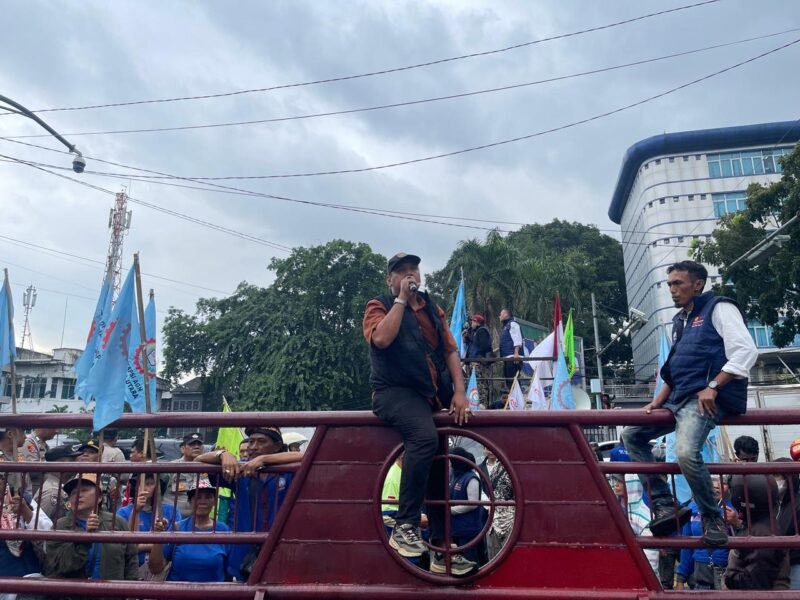 MEDAN, SUARASUMUTONLINE.ID– Ratusan buruh yang tergabung dalam Konfederasi Serikat Pekerja Seluruh Indonesia (KSPSI) AGN Sumatera Utara menggelar aksi unjuk rasa di Balai Kota Medan, Kamis (9/4/2026). Aksi ini dilakukan sebagai bentuk protes keras sekaligus tuntutan keadilan atas meninggalnya seorang pekerja dalam proyek pembangunan Islamic Centre.