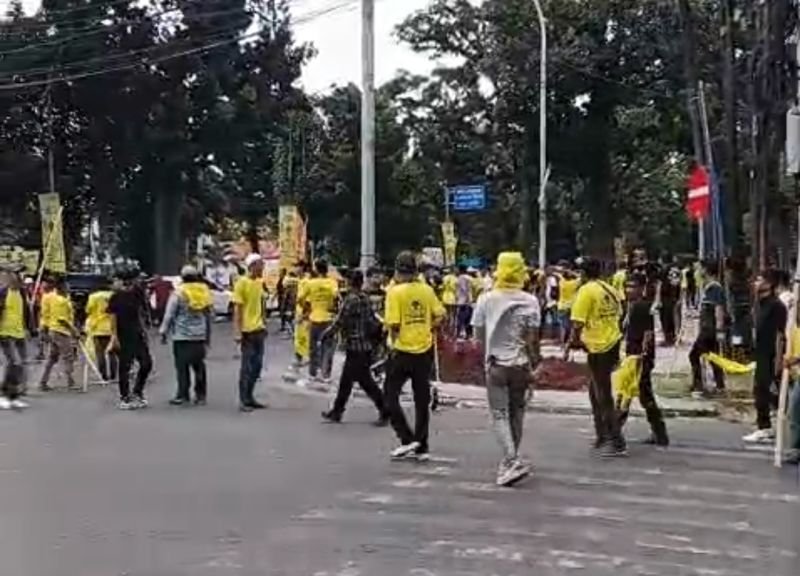 Pantauan wartawan di lokasi, kericuhan terjadi di luar arena musda, persisnya di luar hotel. Di depan Hotel JW Marriott, terlihat Sekelompok orang memakai seragam kuning tampak berteriak.