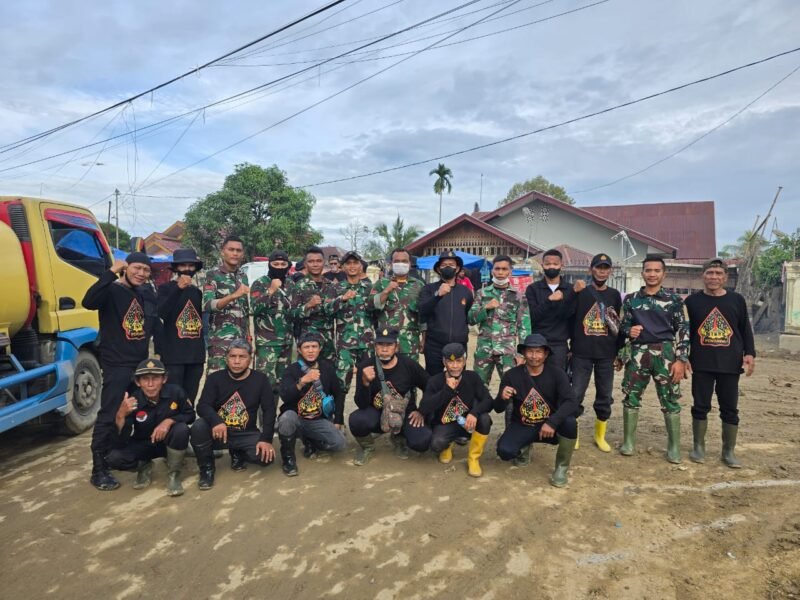 Jajaran pengurus DPAC Pendawa Kec.Patumbak mengikuti penyiraman cairan Microba PA 63 bersama pengurus PB Pendawa Indonesia dan TNI AD, guna percepatan pemulihan sanitasi lingkungan dalam upaya sterilisasi di wilayah terdampak banjir bandang Kab.Aceh Tamiang, kemarin.