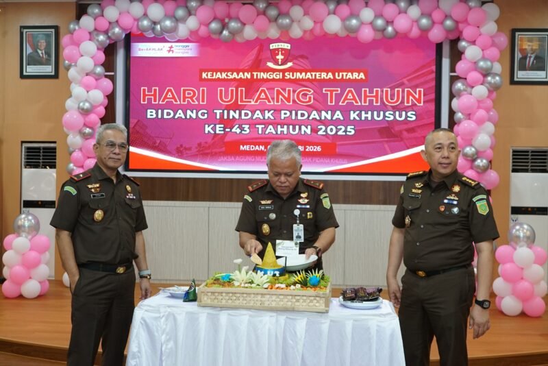 MEDAN, SUARASUMUTONLINE.ID – Kajati Sumatera Utara Dr.Harli Siregar,SH.,M.Hum bersama Wakajati Sumut Abdullah Noer Denny,SH.,MH beserta para pejabat utama (PJU), para koordinator, kepala Seksi serta para Jaksa Penyidik maupun Jaksa Fungsional dan jajaran bidang pidana khusus Kejati Sumut mengikuti peringatan hari ulang tahun ke-43 bidang pidsus Kejaksaan R.I tahun 2026 secara daring (zoom online) dari aula cipta kerta lantai III Kejati Sumatera Utara.