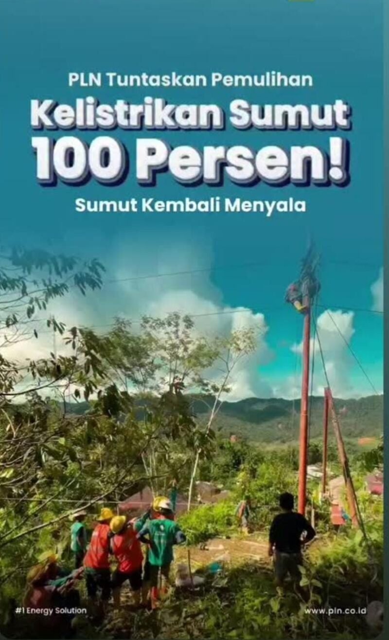 MEDAN, SUARASUMUTONLINE.ID– PT PLN (Persero) berhasil memulihkan 100% sistem kelistrikan yang terdampak banjir dan longsor di Sumatera Utara (Sumut). Kecamatan Sorkam, Kabupaten Tapanuli Tengah, menjadi wilayah terakhir yang kembali menyala.