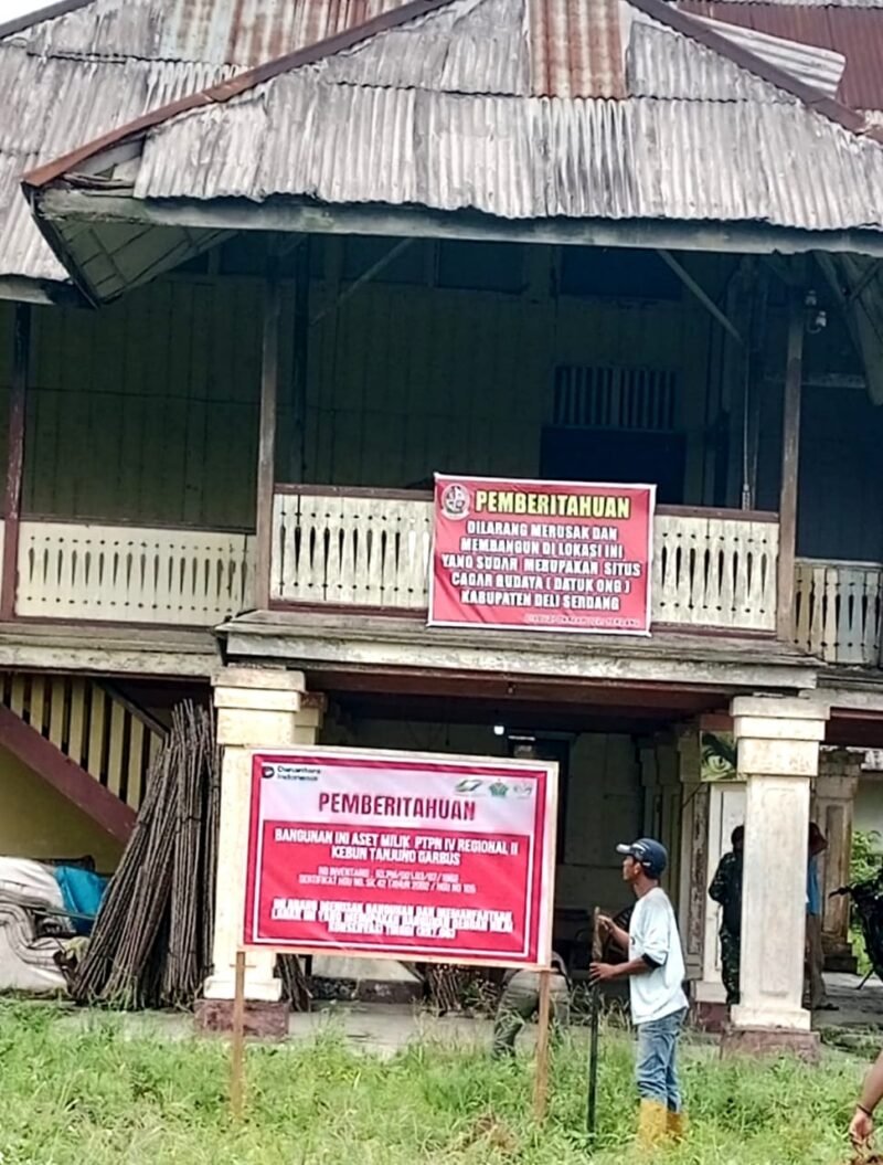 DELI SERDANG, SUARASUMUTONLINE.ID – Pasca penetapan situs Cagar Budaya oleh Dinas Kebudayaan Pemuda Olahraga dan Pariwisata (Disbudporapar) Kabupaten Deli Serdang terhadap rumah khas Melayu (situs) milik ex PTP IX yang sekarang menjadi PTPN 4 REGIONAL 2 yang berlokasi di Desa Pagar Merbau I Kecamatan Pagar Merbau kabupaten Deli Serdang akhirnya di pasangkan plank bertujuan untuk memberitahukan secara publik bahwa kawasan tersebut dalam HGU PTPN4 REGIONAL 2.