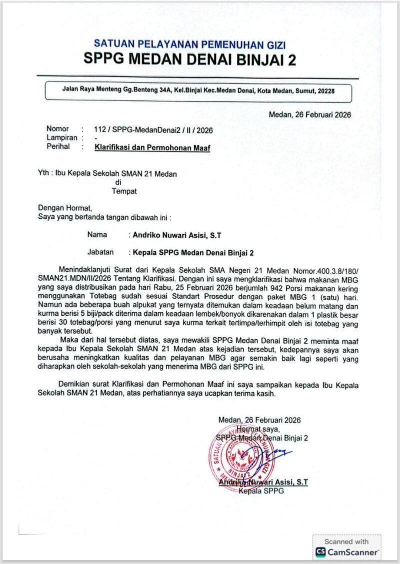 ” Menindaklanjuti surat dari kepala sekolah SMA Negeri 21 Medan dengan ini saya mengklarifikasi makan MBG yang saya distribusi kan pada hari Rabu (25/2) berjumlah 942 porsi mengunakan totenbag sudah sesuai standar prosedur dengan paket MBG satu hari,namun ada beberapa buah alpukat yang ditemukan belum matang dan kurma 5 biji/pack dalam keadaan bonyok/lembek, dikarenakan dalam 1 totenbag berisi 30 porsi yang menurut saya kurma tersebut tertipah/terhimpit oleh isi totenbag yang banyak tersebut. Maka karena hal tersebut, saya mewakili SPPG) Medan Denai Binjai 2 meminta maaf kepada ibu kepala sekolah SMAN 21 Medan atas kejadian tersebut, kedepannya saya akan meningkatkan kualitas dan pelayanan MBG agar lebih baik seperti yang diharapkan oleh sekolah-sekolah yang menerima MBG dari SPPG kami,” urai kepala SPPG) Medan Denai Binjai 2 dalam surat tertulis nya kepada pihak Kepala Sekolah SMA Negeri 21 Medan (28/2).