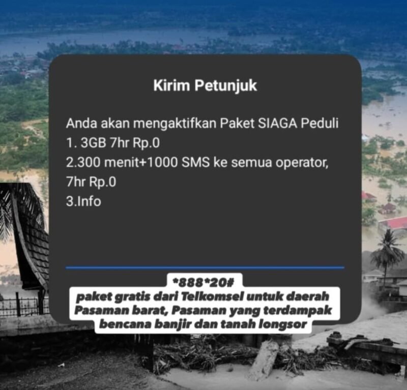 * masukkan kode *888*20# ‘Telkomsel hadir mendukung komunikasi di Sumatera. Aktifitas paket Siaga Perduli berlaku 7 hari tanpa biaya’.