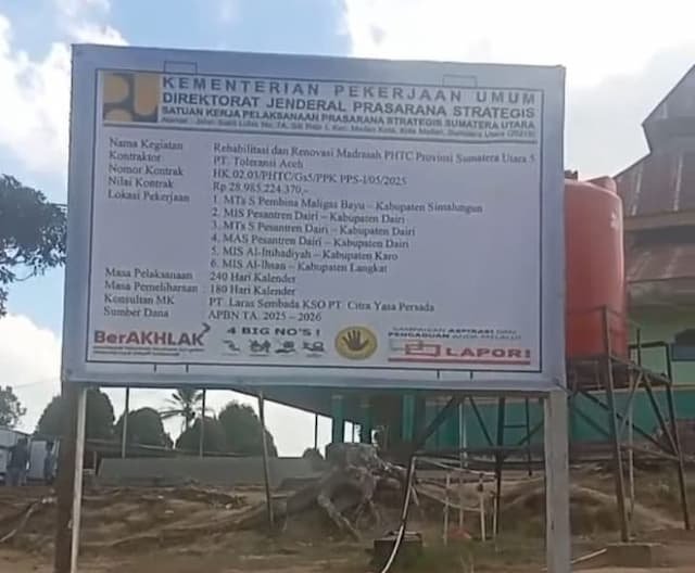 Nama kegiatan Rehabilitasi dan Renovasi Madrasah PHTC Provinsi Sumatera Utara. Kontraktor PT Toleransi Aceh. Nomor kontrak HK 02.03/PHTC/G.5/PPK PPS.1/05/2025. Nilai kontrak Rp28.985.224.370.