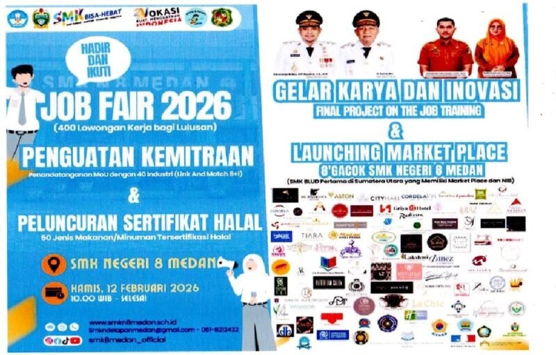 ” Acara ini juga akan dirangkai dengan kegiatan Job Fair dan penandatanganan MOU dengan 40 industri serta peluncuran 50 produk makanan dan minuman bersertifikat halal, kegiatan akan dilaksanakan di halaman sekolah SMKN 8 Jl Dr Mansyur Medan, pada tanggal 12 February 2026 pukul 10.00- selesai, ” ulas Kepala SMKN 8 Medan Wilma Handayani SPd, MSi, Jumat (30/1).