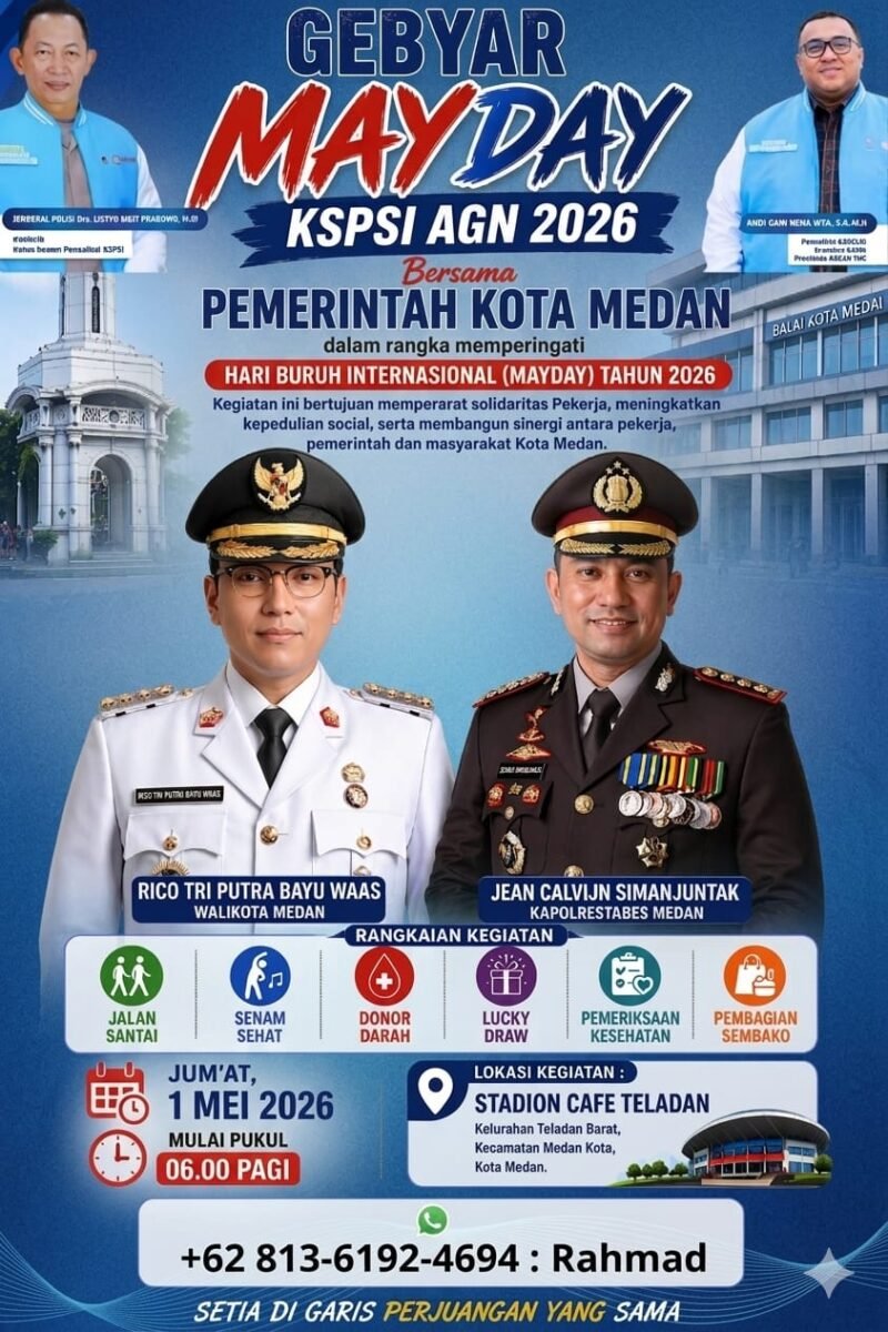 MEDAN, SUARASUMUTONLINE.ID – Serikat Pekerja Seluruh Indonesia (SPSI) AGN Kota Medan akan menggelar peringatan Hari Buruh Internasional (May Day) dengan konsep yang lebih meriah dan menyentuh langsung kebutuhan masyarakat. Tidak hanya sebagai ajang seremonial tahunan, kegiatan ini juga dikemas dalam bentuk kolaborasi antara buruh, pemerintah, dan aparat keamanan, sekaligus menjadi bagian dari upaya menyambut perhelatan Piala AFF yang direncanakan berlangsung di Kota Medan.