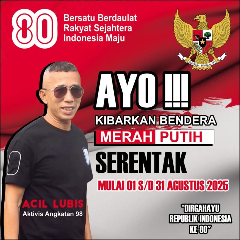 ” Dalam rangka menyambut hari kemerdekaan Republik Indonesia yang ke 80 saya mengajak seluruh lapisan masyarakat untuk mengibarkan bendera merah putih dari tanggal 1 Agustus 2025 sampai dengan 31 Agustus 2025. Sebagai bentuk cinta tanah air dan semarak kemerdekaan Republik Indonesia tercinta, ” Ajak Acil Lubis, Sabtu (2/8).