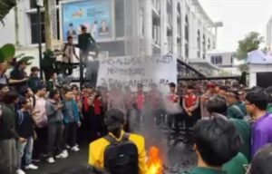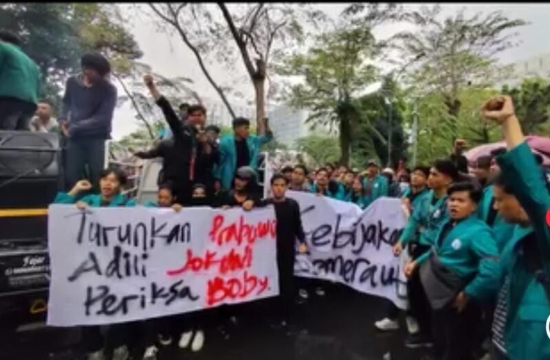 MEDAN, SUARASUMUTONLINE.ID – Ratusan mahasiswa Universitas Negeri Medan (UNIMED) menggelar aksi unjuk rasa di Jalan Imam Bonjol, depan Gedung DPRD Sumut, Selasa (2/9).